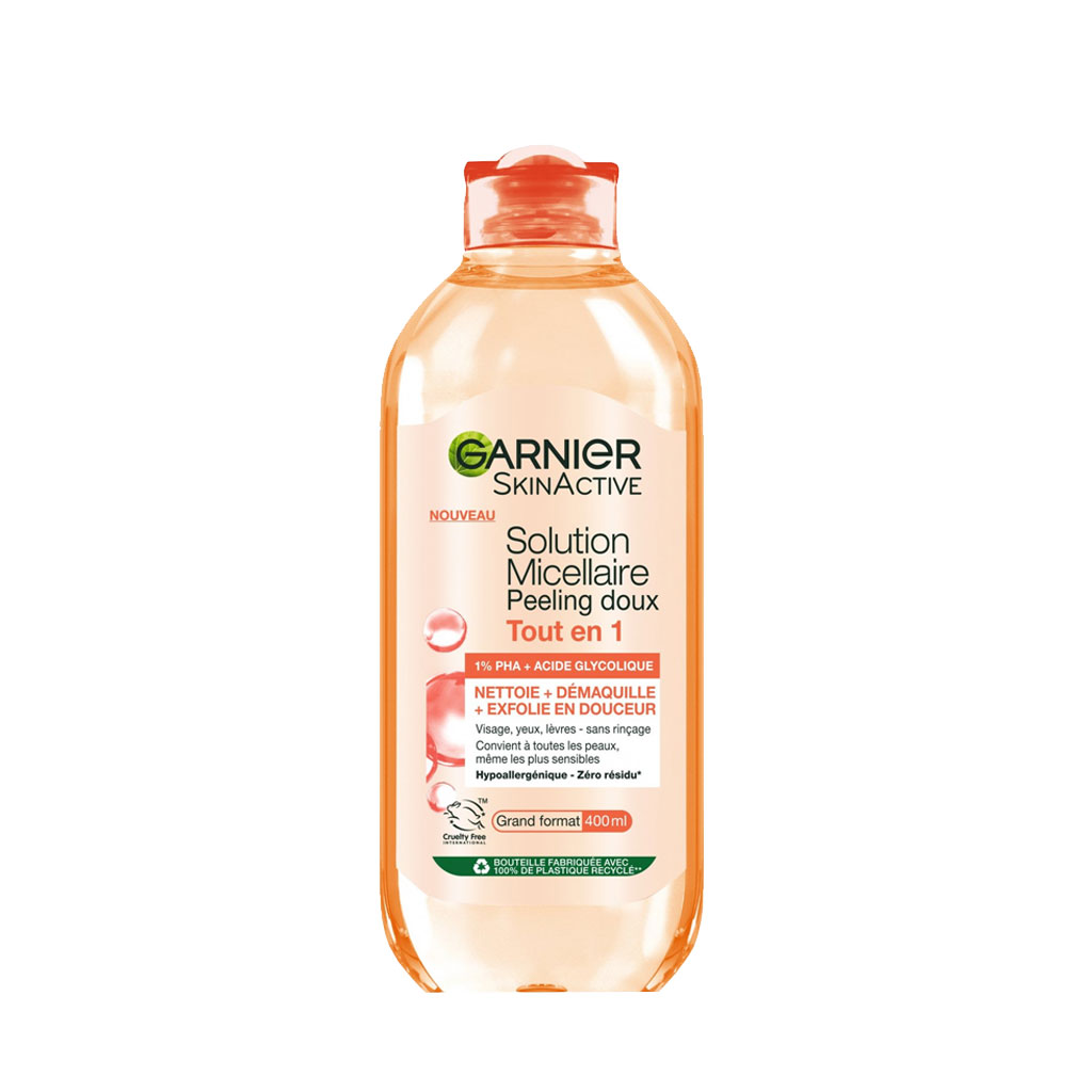 Découvrez la Solution Micellaire Tout en 1 Peeling Doux de Garnier, la marque micellaire N°1 la plus achetée en France*, elle nettoie, démaquille et exfolie en douceur pour une peau plus lisse en un seul geste. *©Kantar WorldpanelBeauty 2022, marché des eaux micellaires en France tous circuits confondus. Nombre d’acheteurs, quantités achetées du 01/01/2022 au 12/06/2022. Une peau nettoyée, plus lisse et un teint plus uniforme.